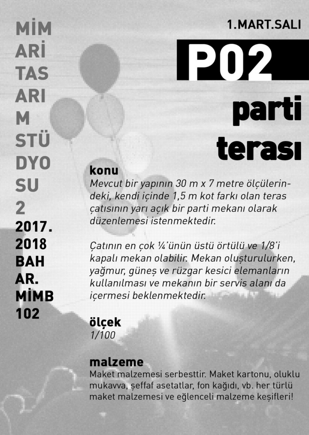 Design Studio 2'de Proje 2'de (Terrace Party) yaptığımız. Mevcut bir yapının 30m x 7m ölçülerindeki, kendi içinde1,5m kot farkı olan teras çatısının yarı açık bir parti mekanı olarak düzenlenmesi istenildi. Bende çatının 1/4'nün üstü örtülü ve 1/8'i kapalı mekan olarak tasarladım. Mekan oluşturulurken, yağmur, güneş ve rüzgar kesici elemanların kullanılması ve mekanın bir servis alanı da içerecek şekilde tamamladım. Temel amacı öğrencilere üç boyutlu düşünme ve görselleştirme yeteneği elde etmektir. Üç boyutlu formlara uygulanan gelişmiş temel tasarım ve grafik ilkelerini ve tasarım unsurlarını vurgulamak için tasarlanmış bir stüdyo dersi. Sosyal ve yerleşik çevre verilerinin mekan ve mimari tasarım üzerindeki etkilerinin incelenmesi. Belirli ortamlardaki uygun faaliyetler nedeniyle mimari ve iç mekan tasarımı oluşturma bilgisine sahip olmak. Çevre-mekan ve yapı ilişkileri farklı tasarım seviyelerinde. Amaç, öğrencilerin fonksiyon-form-uygulama-kullanım sürecini kavramalarını sağlamaktır.